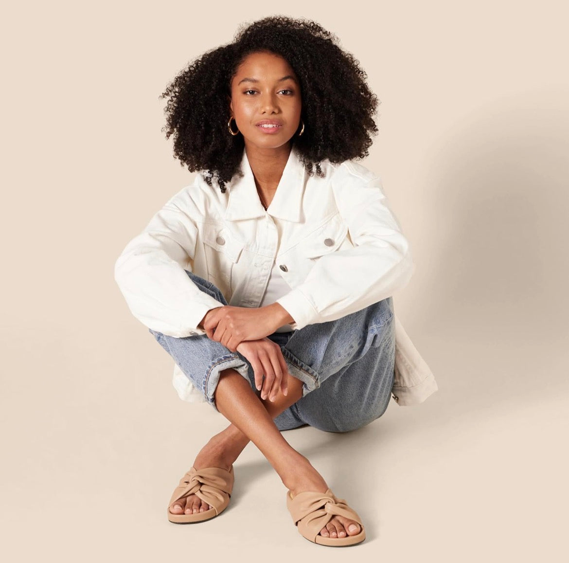 Casual knotted slide sandals for everyday wear. Soft, crisscross knotted straps for a chic look. Cushioned footbed for comfort. Slip-on design for easy wear. Neutral beige pairs well with many outfits.
